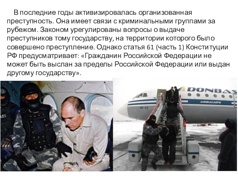 с криминальными группами за рубежом. Законом урегулированы вопросы о выдаче преступников тому государству, на территории которого было совершено преступление. Однако статья 61 (часть 1) Конституции РФ предусматривает: «Гражданин Российской Федерации не может быть выслан за пределы Российской Федерации или выдан другому государству».