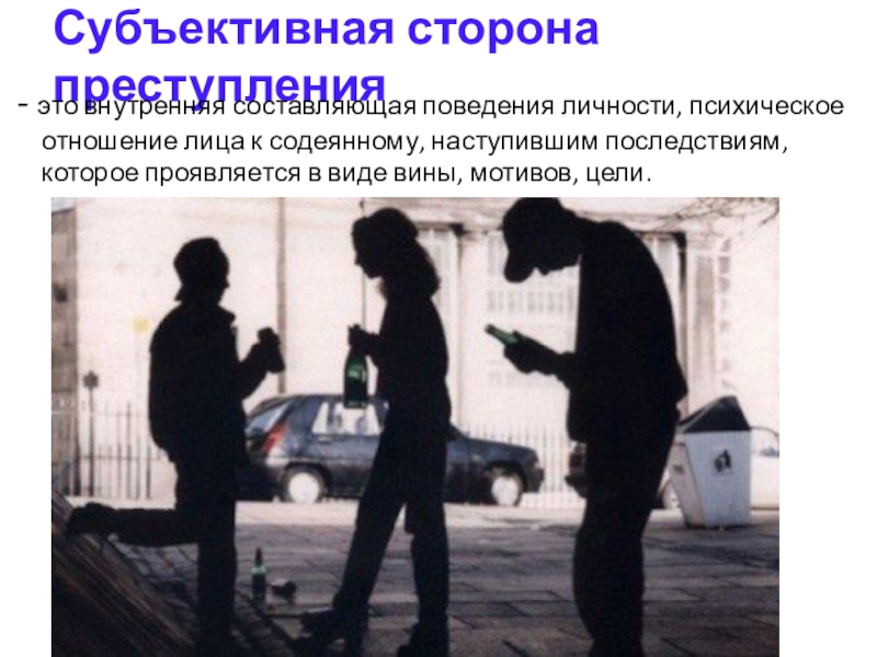 отношение лица к содеянному, наступившим последствиям, которое проявляется в виде вины, мотивов, цели.