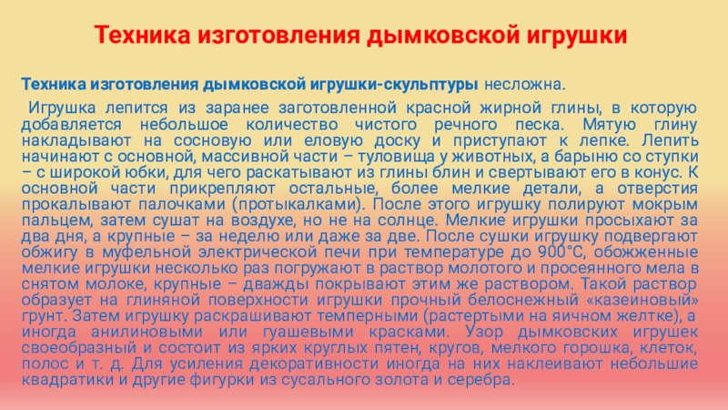 заранее заготовленной красной жирной глины, в которую добавляется небольшое количество чистого речного песка. Мятую глину накладывают на сосновую или еловую доску и приступают к лепке. Лепить начинают с основной, массивной части – туловища у животных, а барыню со ступки – с широкой юбки, для чего раскатывают из глины блин и свертывают его в конус. К основной части прикрепляют остальные, более мелкие детали, а отверстия прокалывают палочками (протыкалками). После этого игрушку полируют мокрым пальцем, затем сушат на воздухе, но не на солнце. Мелкие игрушки просыхают за два дня, а крупные – за неделю или даже за две. После сушки игрушку подвергают обжигу в муфельной электрической печи при температуре до 900°С, обожженные мелкие игрушки несколько раз погружают в раствор молотого и просеянного мела в снятом молоке, крупные – дважды покрывают этим же раствором. Такой раствор образует на глиняной поверхности игрушки прочный белоснежный «казеиновый» грунт. Затем игрушку раскрашивают темперными (растертыми на яичном желтке), а иногда анилиновыми или гуашевыми красками. Узор дымковских игрушек своеобразный и состоит из ярких круглых пятен, кругов, мелкого горошка, клеток, полос и т. д. Для усиления декоративности иногда на них наклеивают небольшие квадратики и другие фигурки из сусального золота и серебра.
