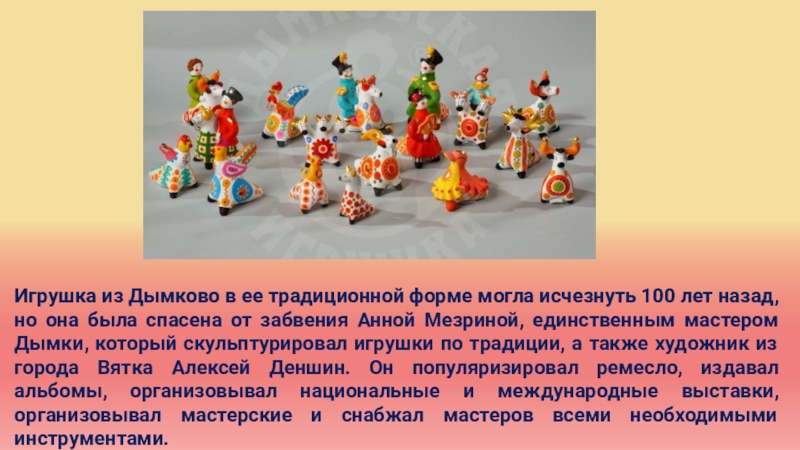 назад, но она была спасена от забвения Анной Мезриной, единственным мастером Дымки, который скульптурировал игрушки по традиции, а также художник из города Вятка Алексей Деншин. Он популяризировал ремесло, издавал альбомы, организовывал национальные и международные выставки, организовывал мастерские и снабжал мастеров всеми необходимыми инструментами.