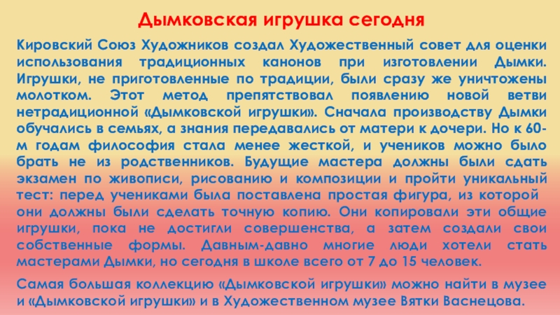 традиционных канонов при изготовлении Дымки. Игрушки, не приготовленные по традиции, были сразу же уничтожены молотком. Этот метод препятствовал появлению новой ветви нетрадиционной «Дымковской игрушки». Сначала производству Дымки обучались в семьях, а знания передавались от матери к дочери. Но к 60-м годам философия стала менее жесткой, и учеников можно было брать не из родственников. Будущие мастера должны были сдать экзамен по живописи, рисованию и композиции и пройти уникальный тест: перед учениками была поставлена простая фигура, из которой они должны были сделать точную копию. Они копировали эти общие игрушки, пока не достигли совершенства, а затем создали свои собственные формы. Давным-давно многие люди хотели стать мастерами Дымки, но сегодня в школе всего от 7 до 15 человек.