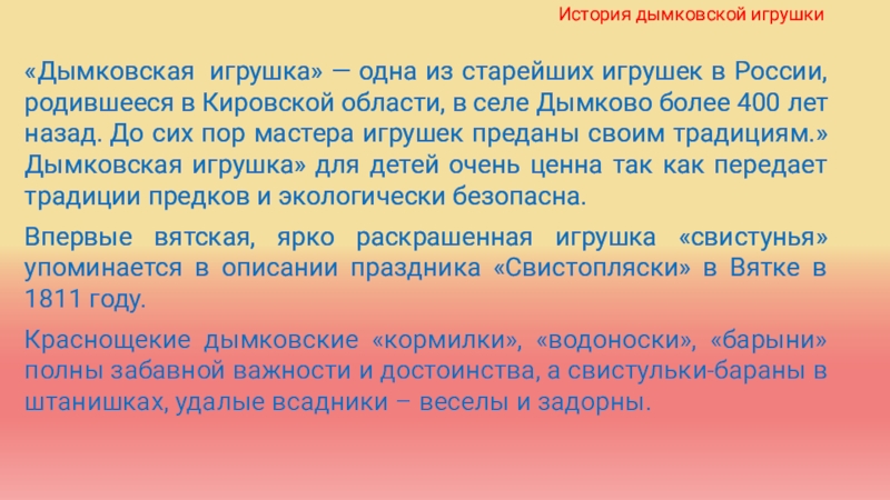 родившееся в Кировской области, в селе Дымково более 400 лет назад. До сих пор мастера игрушек преданы своим традициям.» Дымковская игрушка» для детей очень ценна так как передает традиции предков и экологически безопасна.