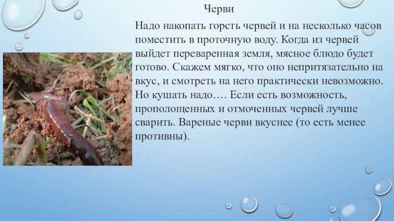 Надо накопать горсть червей и на несколько часов поместить в проточную воду. Когда из червей выйдет переваренная земля, мясное блюдо будет готово. Скажем мягко, что оно непритязательно на вкус, и смотреть на него практически невозможно. Но кушать надо…. Если есть возможность, прополощенных и отмоченных червей лучше сварить. Вареные черви вкуснее (то есть менее противны).