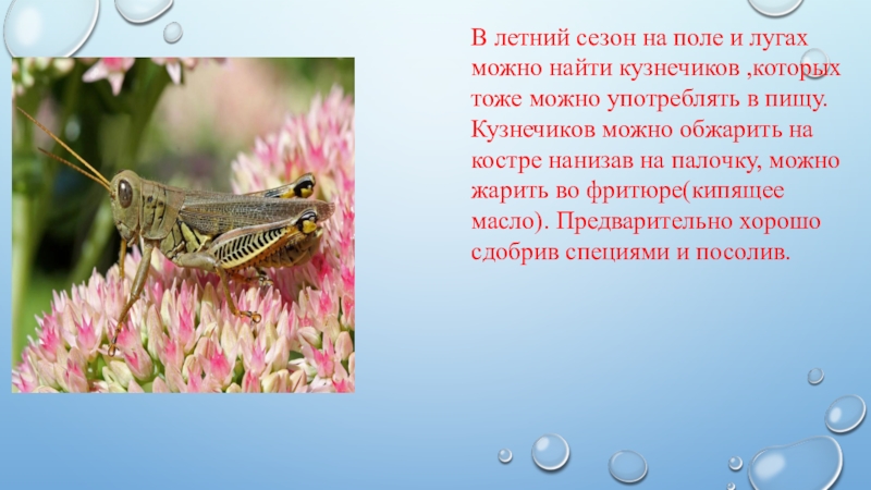 Слайд 9В летний сезон на поле и лугах можно найти кузнечиков ,которых