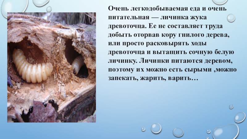 Слайд 8Очень легкодобываемая еда и очень питательная — личинка жука древоточца. Ее