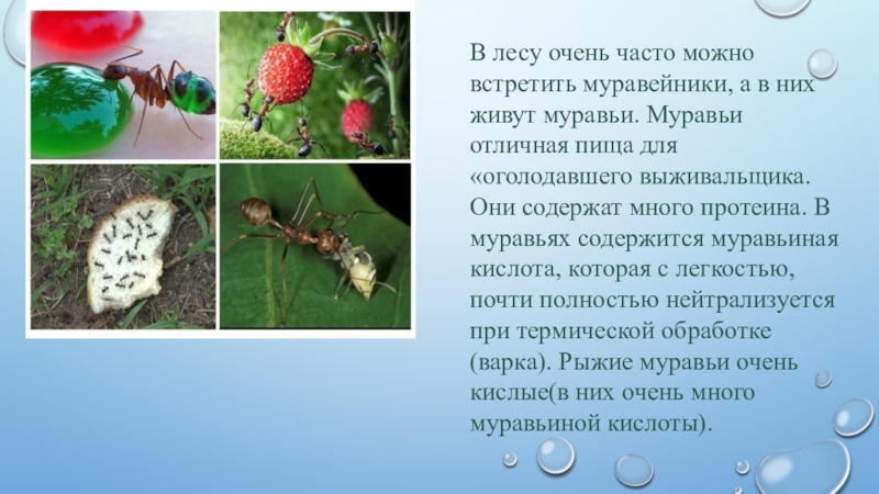 муравьи. Муравьи отличная пища для «оголодавшего выживальщика. Они содержат много протеина. В муравьях содержится муравьиная кислота, которая с легкостью, почти полностью нейтрализуется при термической обработке(варка). Рыжие муравьи очень кислые(в них очень много муравьиной кислоты).