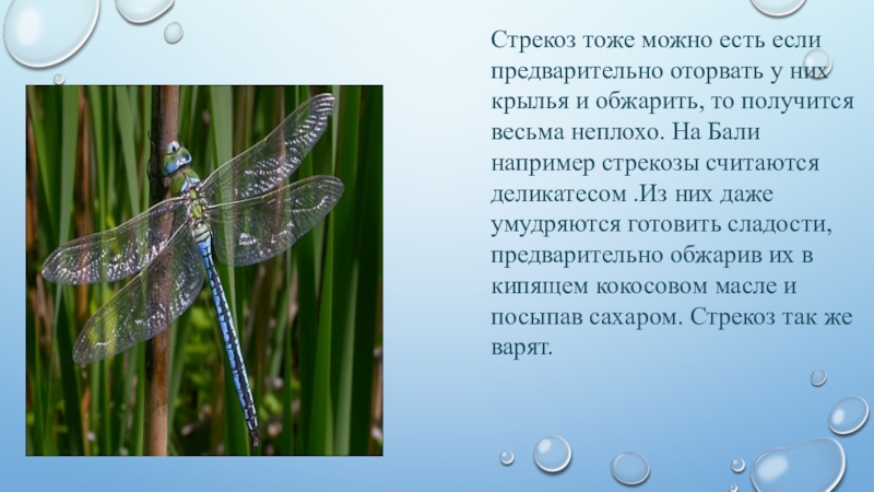 Слайд 10Стрекоз тоже можно есть если предварительно оторвать у них крылья и