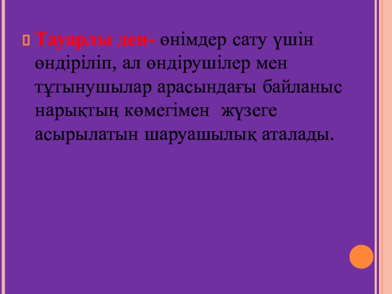Слайд 5Тауарлы деп- өнімдер сату үшін өндіріліп, ал өндірушілер мен тұтынушылар арасындағы