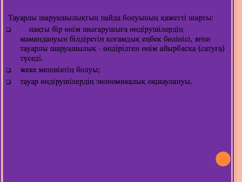 : Тауарлы өндірістің даму сипаты айырбаспен нарықтың дамуына байланысты.жеке меншіктің пайда болуы;тұтынушылар өз қажетін қанағаттандыра алу қабылеттілігі;еркін