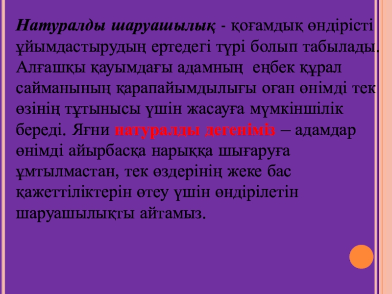 Слайд 3Натуралды шаруашылық - қоғамдық өндірісті ұйымдастырудың ертедегі түрі болып табылады. Алғашқы