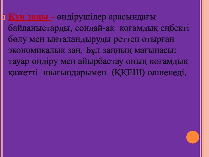Слайд 10Құн заңы - өндірушілер арасындағы байланыстарды, сондай-ақ қоғамдық еңбекті бөлу мен