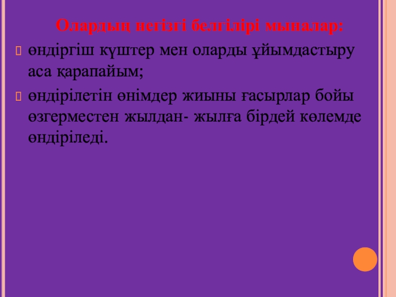 Олардың негізгі белгілірі мыналар:өндіргіш күштер мен оларды ұйымдастыру аса қарапайым;өндірілетін өнімдер жиыны ғасырлар бойы өзгерместен жылдан- жылға