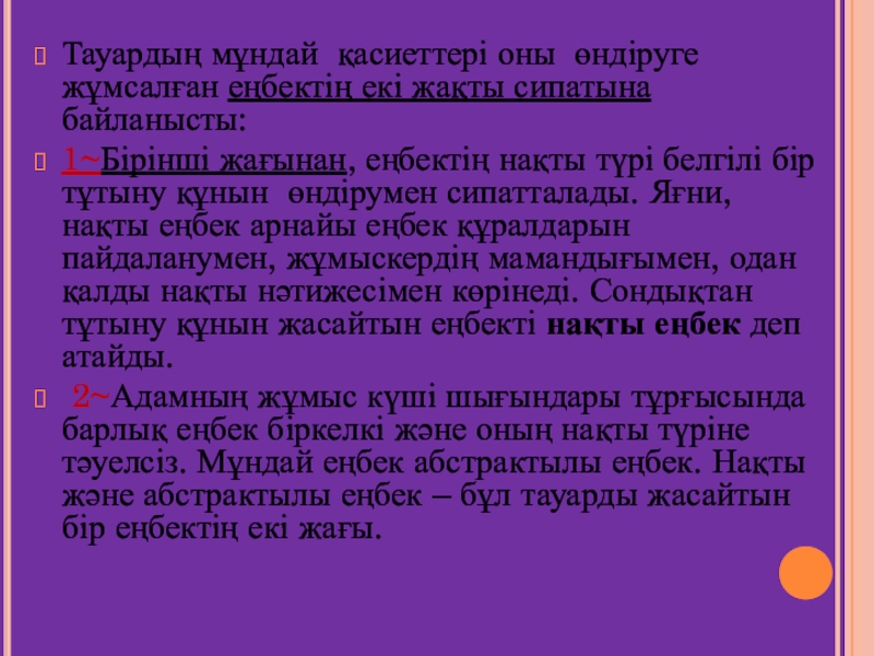 Слайд 9Тауардың мұндай қасиеттері оны өндіруге жұмсалған еңбектің екі жақты сипатына байланысты: