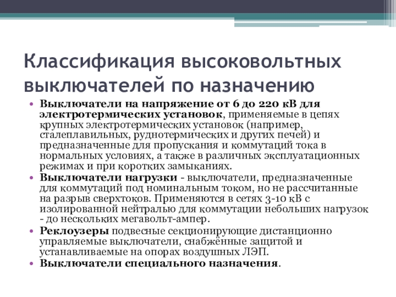 Слайд 7Классификация высоковольтных выключателей по назначению