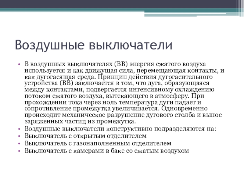 движущая сила, перемещающая контакты, и как дугогасящая среда. Принцип действия дугогасительного устройства (ВВ) заключается в том, что дуга, образующаяся между контактами, подвергается интенсивному охлаждению потоком сжатого воздуха, вытекающего в атмосферу. При прохождении тока через ноль температура дуги падает и сопротивление промежутка увеличивается. Одновременно происходит механическое разрушение дугового столба и вынос заряженных частиц из промежутка.