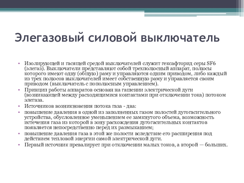 Принцип работы аппаратов основан на гашении электрической дуги (возникающей между расходящимися контактами при отключении тока) потоком элегаза.