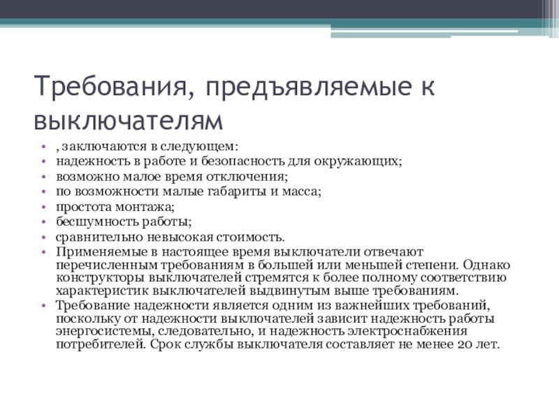 Применяемые в настоящее время выключатели отвечают перечисленным требованиям в большей или меньшей степени. Однако конструкторы выключателей стремятся к более полному соответствию характеристик выключателей выдвинутым выше требованиям.