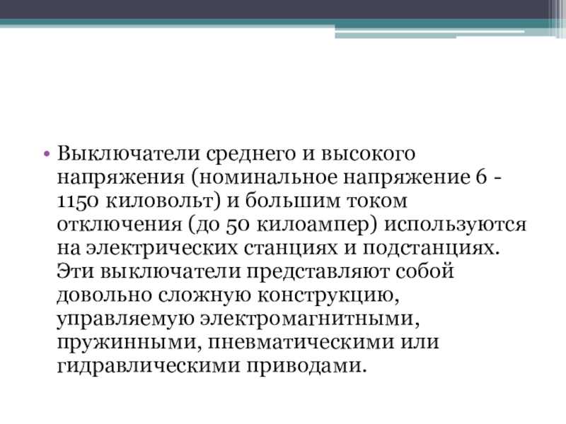 и большим током отключения (до 50 килоампер) используются на электрических станциях и подстанциях. Эти выключатели представляют собой довольно сложную конструкцию, управляемую электромагнитными, пружинными, пневматическими или гидравлическими приводами.
