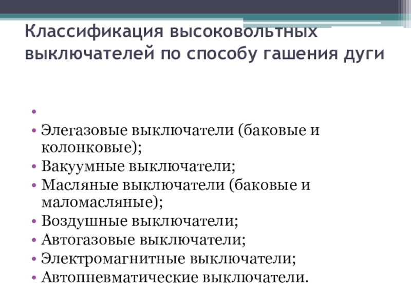 Слайд 5Классификация высоковольтных выключателей по способу гашения дуги