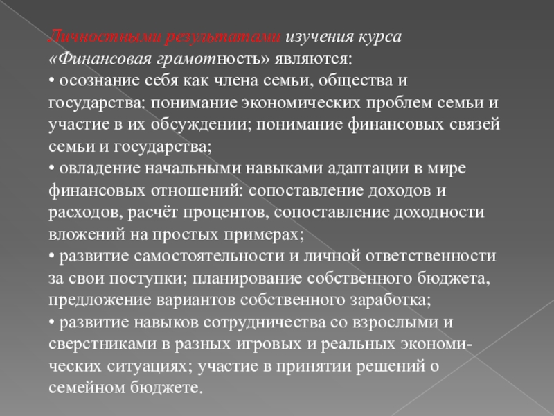 Слайд 5Личностными результатами изучения курса «Финансовая грамотность» являются: