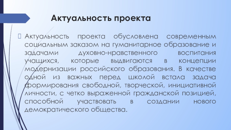 Актуальность проекта обусловлена современным социальным заказом на гуманитарное образование и