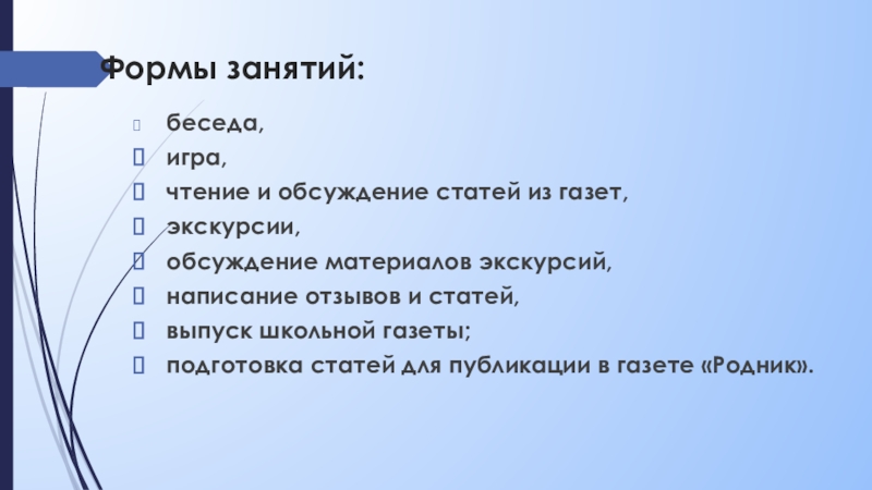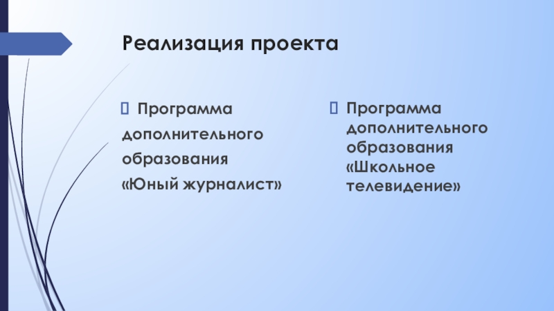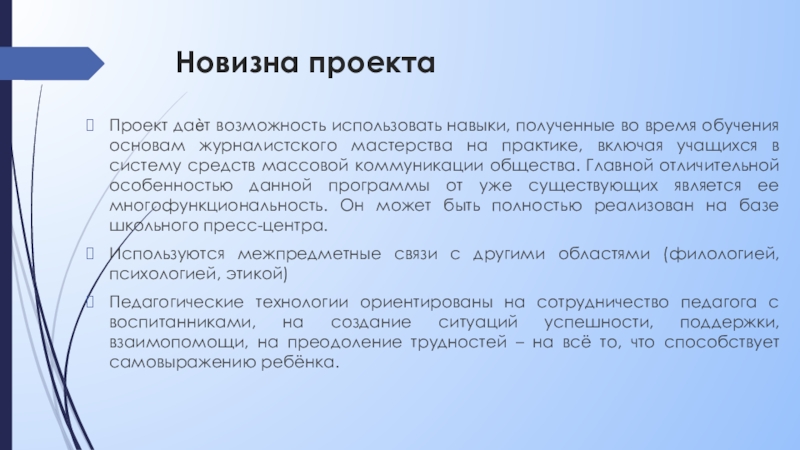 журналистского мастерства на практике, включая учащихся в систему средств массовой коммуникации общества. Главной отличительной особенностью данной программы от уже существующих является ее многофункциональность. Он может быть полностью реализован на базе школьного пресс-центра.