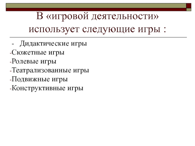 В «игровой деятельности» использует следующие игры :-  Дидактические игрыСюжетные игрыРолевые игрыТеатрализованные игрыПодвижные игрыКонструктивные игры