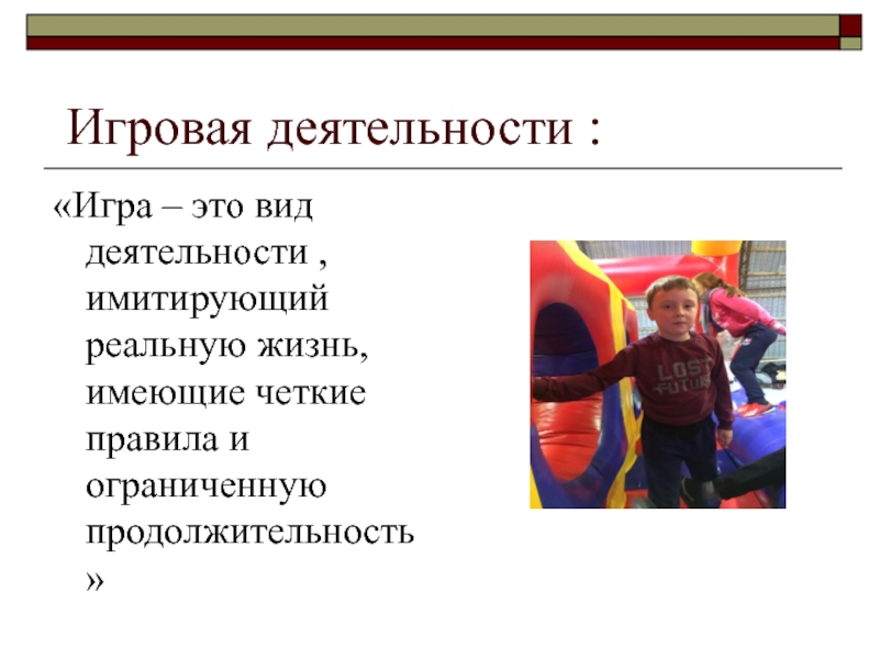 Игровая деятельности :«Игра – это вид деятельности , имитирующий реальную жизнь, имеющие четкие правила и ограниченную