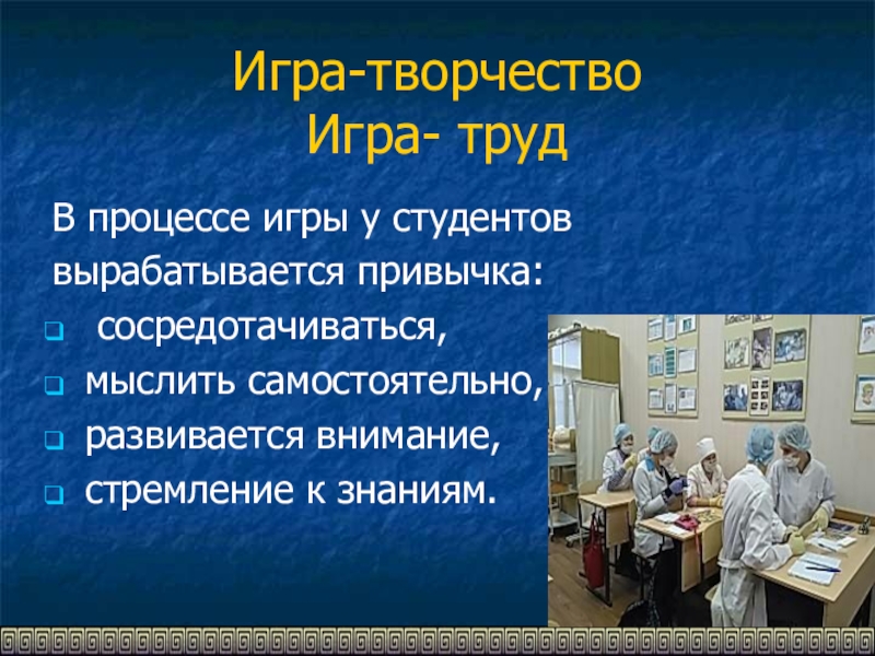 Игра-творчество Игра- трудВ процессе игры у студентоввырабатывается привычка: сосредотачиваться, мыслить самостоятельно, развивается внимание, стремление к знаниям.
