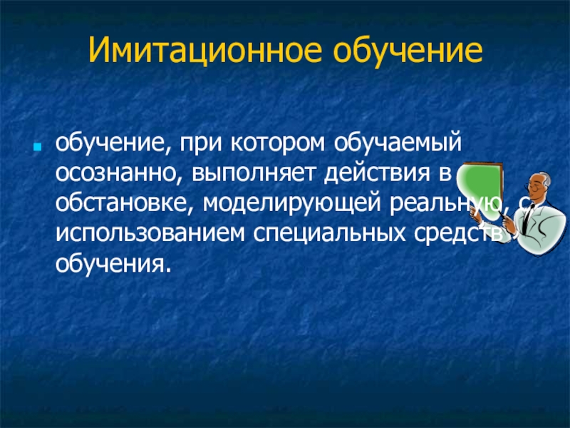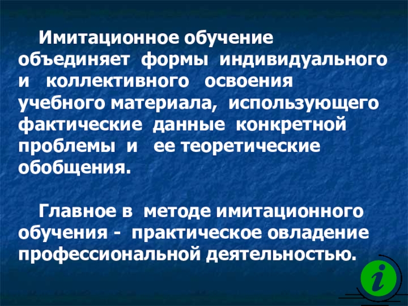 Имитационное обучение объединяет формы индивидуального  и  коллективного  освоения  учебного материала, использующего фактические данные