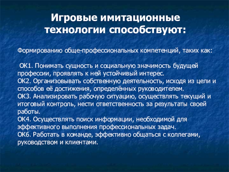 Игровые имитационные технологии способствуют:Формированию обще-профессиональных компетенций, таких как: ОК1. Понимать сущность и социальную значимость будущей профессии, проявлять