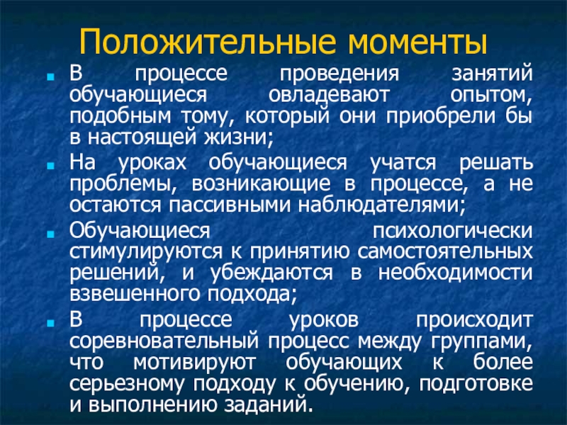 Положительные моментыВ процессе проведения занятий обучающиеся овладевают опытом, подобным тому, который они приобрели бы в настоящей жизни;
