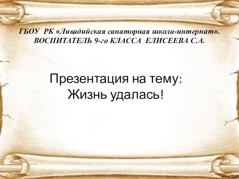 Презентация на тему: Жизнь удалась!ГБОУ РК «Ливадийская санаторная школа-интернат».ВОСПИТАТЕЛЬ 9-го КЛАССА ЕЛИСЕЕВА С.А.