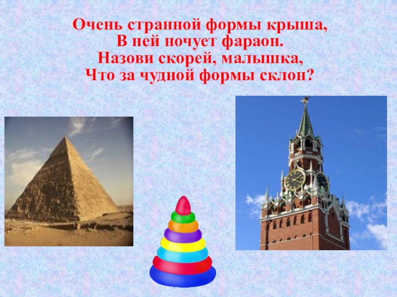Очень странной формы крыша, В ней ночует фараон. Назови скорей, малышка, Что за чудной