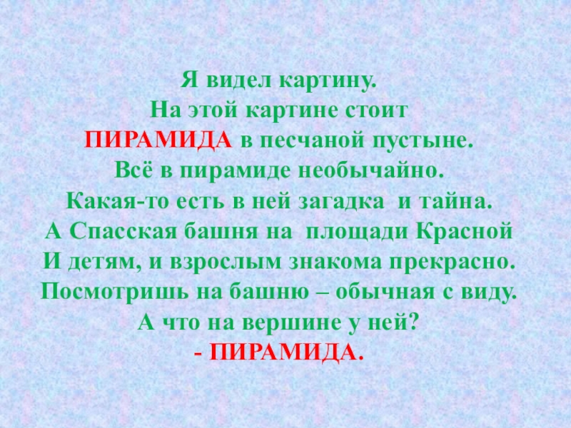 Я видел картину.На этой картине стоитПИРАМИДА в песчаной пустыне.Всё в пирамиде необычайно.Какая-то есть в ней загадка и