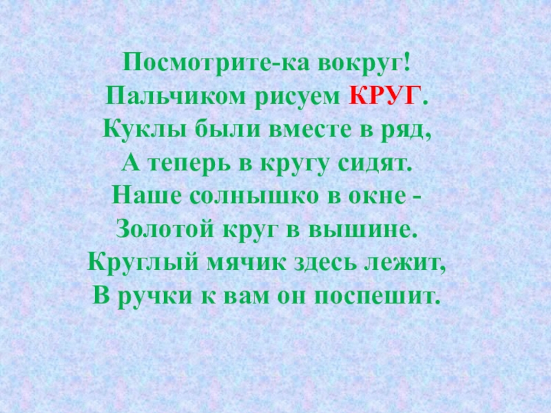 Слайд 10Посмотрите-ка вокруг! Пальчиком рисуем КРУГ. Куклы были вместе в ряд, А теперь в кругу