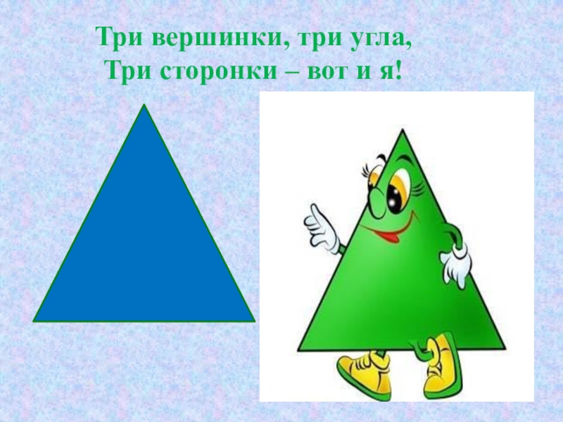 Слайд 3Три вершинки, три угла, Три сторонки – вот и я!