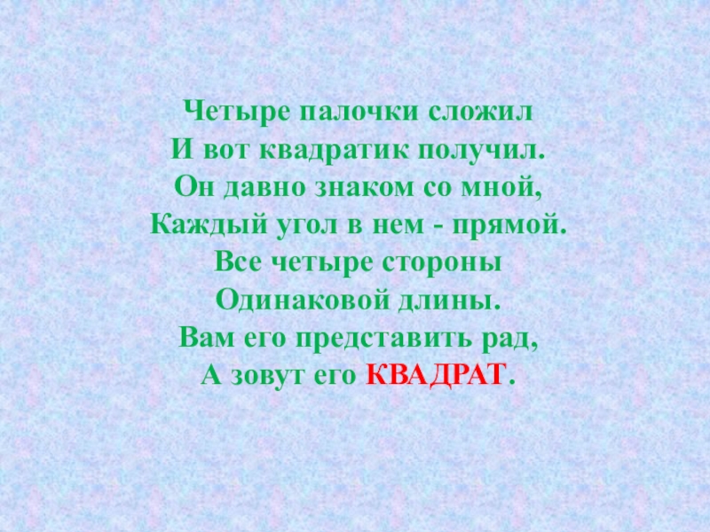 в нем - прямой. Все четыре стороны Одинаковой длины. Вам его представить рад, А зовут его КВАДРАТ.