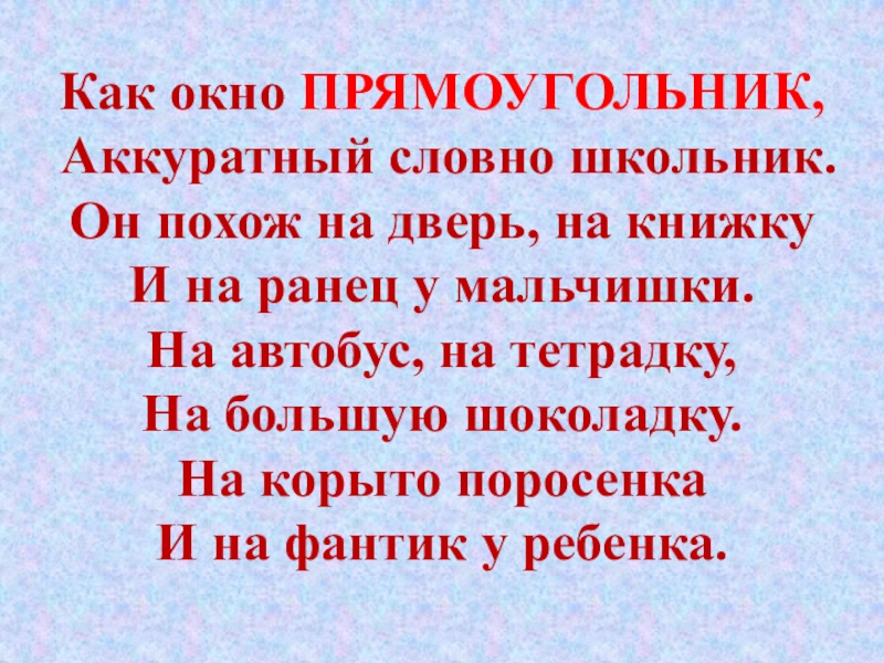 Как окно ПРЯМОУГОЛЬНИК, Аккуратный словно школьник. Он похож на дверь, на книжку И на ранец у мальчишки.