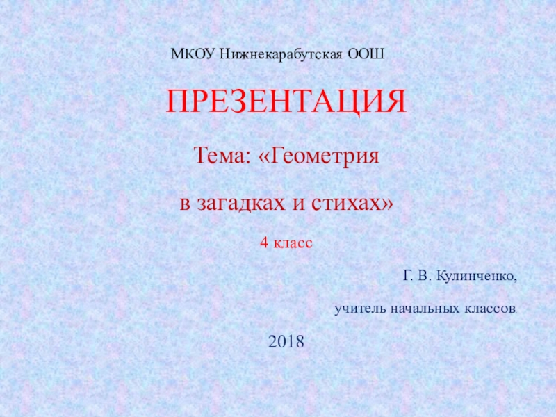 МКОУ Нижнекарабутская ООШПРЕЗЕНТАЦИЯ  Тема: «Геометрия в загадках и стихах»4 класс Г. В. Кулинченко, учитель начальных классов.2018