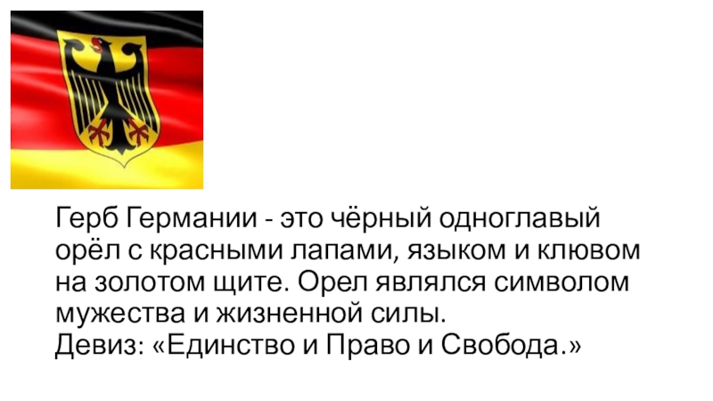 Слайд 3 Герб Германии - это чёрный одноглавый орёл с красными лапами, языком