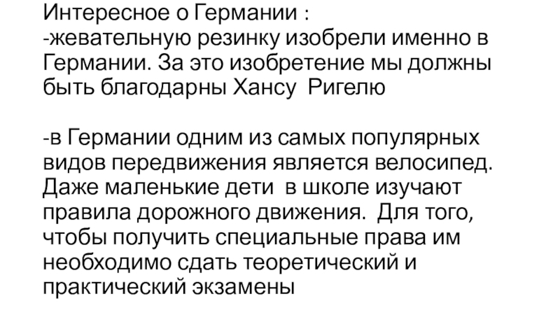 Интересное о Германии : -жевательную резинку изобрели именно в Германии. За это изобретение мы должны быть благодарны