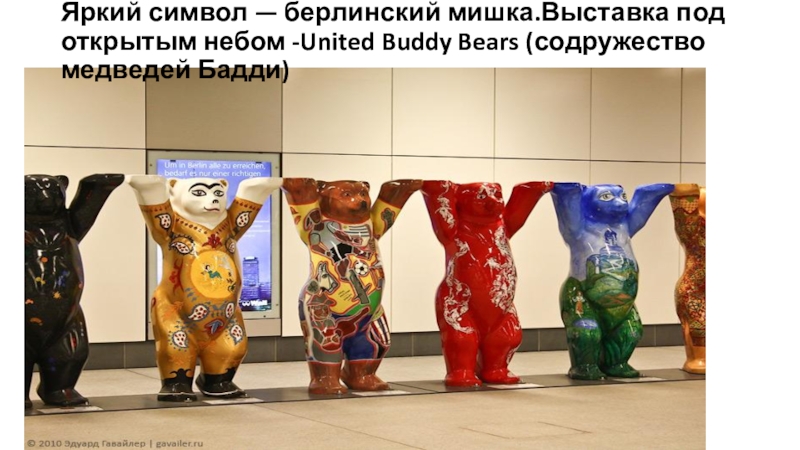 Слайд 10 Яркий символ — берлинский мишка.Выставка под открытым небом -United Buddy Bears