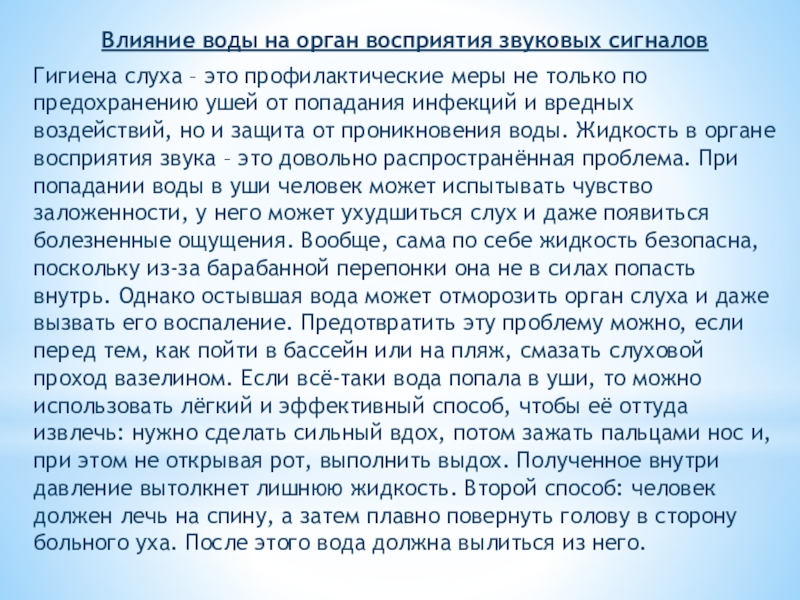 профилактические меры не только по предохранению ушей от попадания инфекций и вредных воздействий, но и защита от проникновения воды. Жидкость в органе восприятия звука – это довольно распространённая проблема. При попадании воды в уши человек может испытывать чувство заложенности, у него может ухудшиться слух и даже появиться болезненные ощущения. Вообще, сама по себе жидкость безопасна, поскольку из-за барабанной перепонки она не в силах попасть внутрь. Однако остывшая вода может отморозить орган слуха и даже вызвать его воспаление. Предотвратить эту проблему можно, если перед тем, как пойти в бассейн или на пляж, смазать слуховой проход вазелином. Если всё-таки вода попала в уши, то можно использовать лёгкий и эффективный способ, чтобы её оттуда извлечь: нужно сделать сильный вдох, потом зажать пальцами нос и, при этом не открывая рот, выполнить выдох. Полученное внутри давление вытолкнет лишнюю жидкость. Второй способ: человек должен лечь на спину, а затем плавно повернуть голову в сторону больного уха. После этого вода должна вылиться из него.