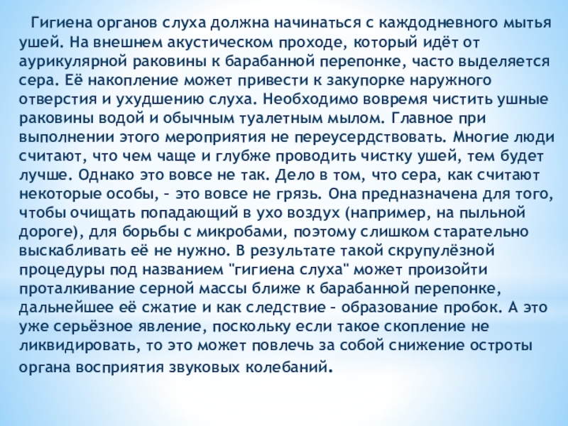 Слайд 7 Гигиена органов слуха должна начинаться с каждодневного мытья ушей. На