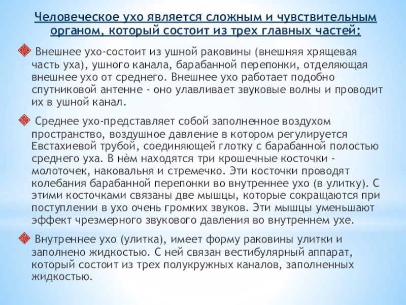 Слайд 6Человеческое ухо является сложным и чувствительным органом, который состоит из трех