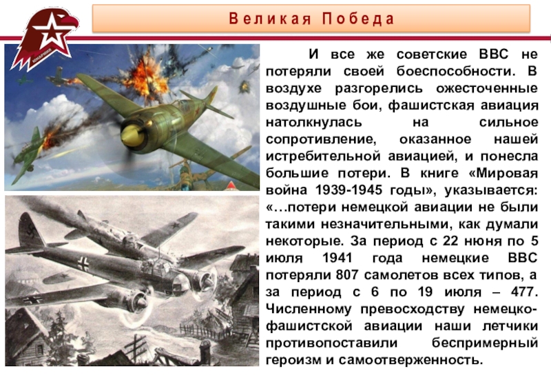И все же советские ВВС не потеряли своей боеспособности. В воздухе разгорелись ожесточенные воздушные бои, фашистская авиация натолкнулась на сильное сопротивление, оказанное нашей истребительной авиацией, и понесла большие потери. В книге «Мировая война 1939-1945 годы», указывается: «…потери немецкой авиации не были такими незначительными, как думали некоторые. За период с 22 нюня по 5 июля 1941 года немецкие ВВС потеряли 807 самолетов всех типов, а за период с 6 по 19 июля – 477. Численному превосходству немецко-фашистской авиации наши летчики противопоставили беспримерный героизм и самоотверженность.