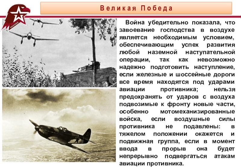Война убедительно показала, что завоевание господства в воздухе является необходимым условием, обеспечивающим успех развития любой наземной наступательной операции, так как невозможно надежно подготовить наступление, если железные и шоссейные дороги все время находятся под ударами авиации противника; нельзя предохранять от ударов с воздуха подвозимые к фронту новые части, особенно мотомеханизированные войска, если воздушные силы противника не подавлены: в тяжелом положении окажется и подвижная группа, если в момент ввода в прорыв она будет непрерывно подвергаться атакам авиации противника.