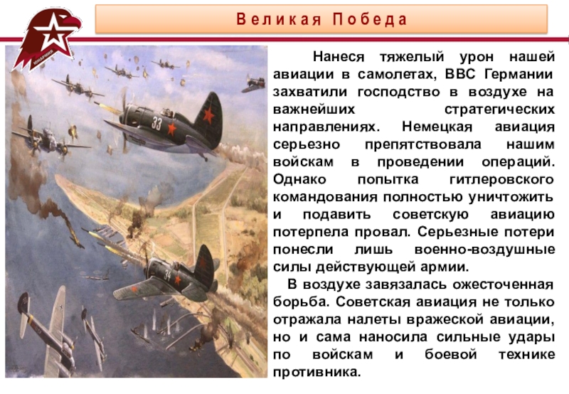 В воздухе завязалась ожесточенная борьба. Советская авиация не только отражала налеты вражеской авиации, но и сама наносила сильные удары по войскам и боевой технике противника.
