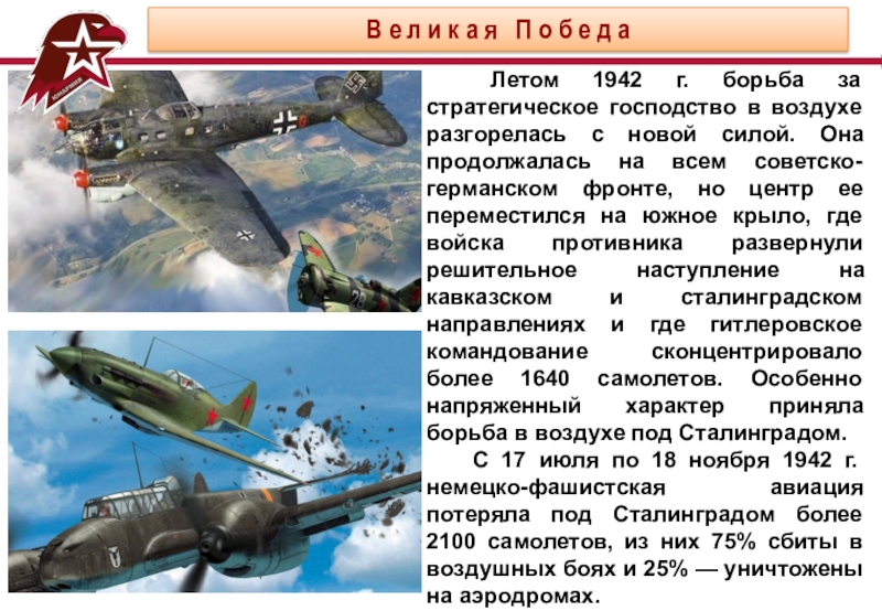 С 17 июля по 18 ноября 1942 г. немецко-фашистская авиация потеряла под Сталинградом более 2100 самолетов, из них 75% сбиты в воздушных боях и 25% — уничтожены на аэродромах.